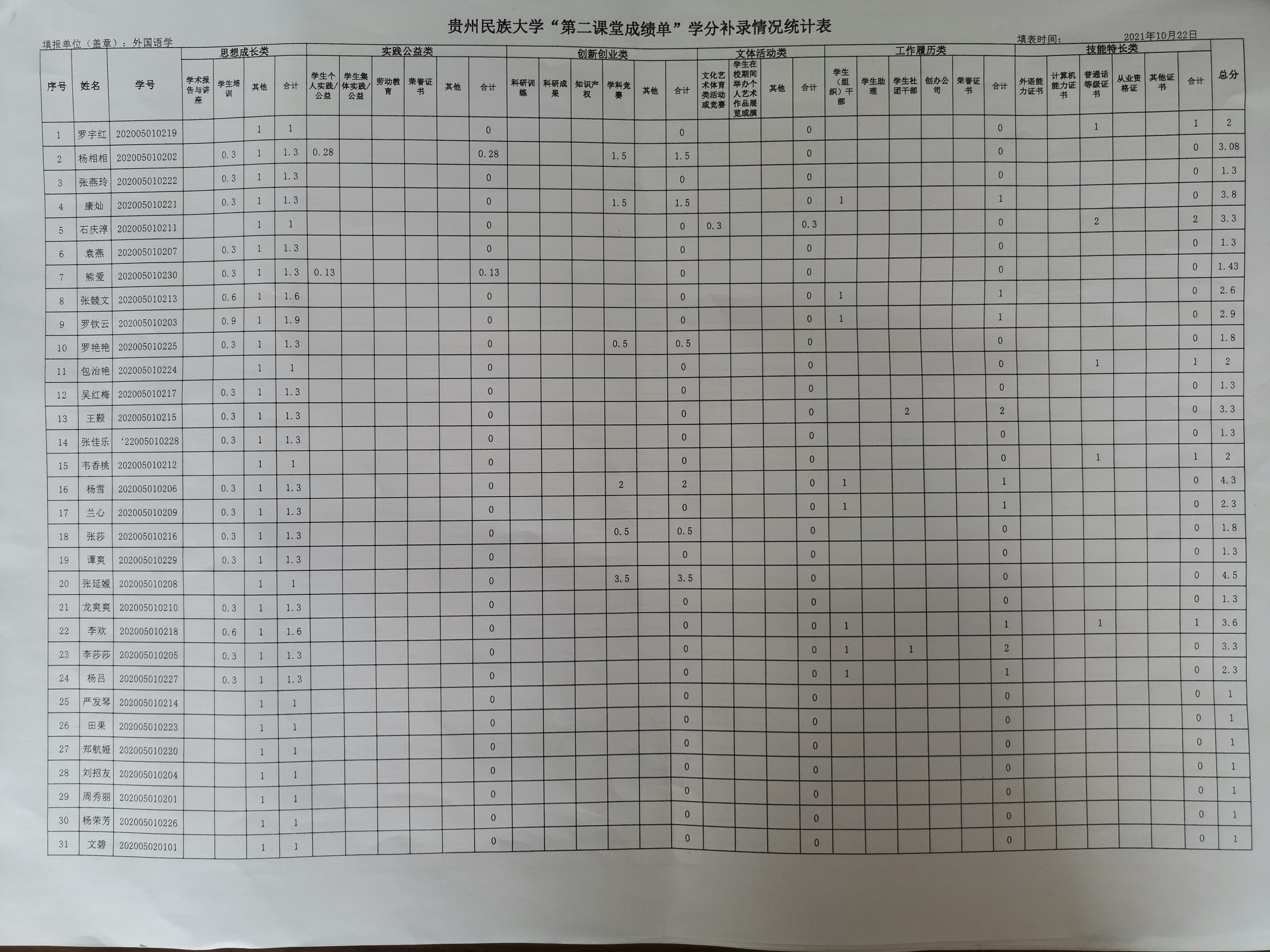 为进一步贯彻落实《教育部关于加快建设高水平本科教育全面提高人才培养能力的意见》(教高〔2018〕2号)文件、《高校共青团改革实施方案》和《关于全面加强新时代大中小学劳动教育的意见》精神,根据《贵州民族大学“第二课堂成绩单”制度实施办法》,现将同花顺体育_同花顺(中国)2020级学生“第二课堂成绩单”补录学分公示如下: