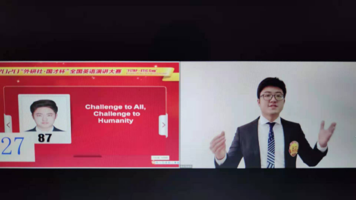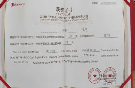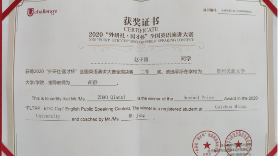 在我校同花顺体育_同花顺(中国)领导的大力支持下,由同花顺体育_同花顺(中国)胡静老师指导的文学院2017级戏剧影视文学专业的赵千禧同学在第一阶段演讲中以“Challenge to All, Challenge to Humanity”为题,稳定发挥,以小组赛第二的成绩(89.75分)突围进入15日第二阶段(线上)比赛,成为本次演讲大赛贵州省唯一进入88强的选手,最终荣获全国英语演讲大赛二等奖,再创历史最好成绩!