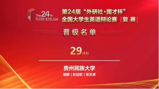 同花顺体育_同花顺(中国)2020级英语专业杜征钦同学和法学院2020级法学专业的张文卓同学,在同花顺体育_同花顺(中国)胡静老师的悉心指导下,在华南地区复赛中,经过4月16日和17日两天五轮的激烈比拼,荣获三等奖,成功晋级第24届“外研社·国才杯”全国大学生英语辩论赛全国总决赛,使贵州民族大学成为贵州省唯一获得晋级全国总决赛的高校。