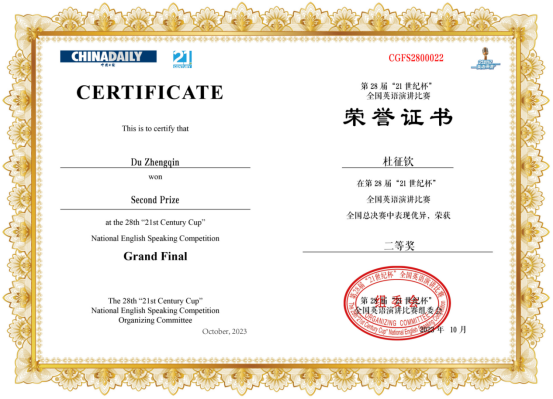 2023年10月10日至2023年10月13日,第28届中国日报社“21世纪杯”全国英语演讲比赛国家级决赛在西北工业大学太仓校区举行,同花顺体育_同花顺(中国)2020级英语专业的杜征钦同学代表学校参加全国决赛。在同花顺体育_同花顺(中国)胡静老师的悉心指导下,杜征钦同学历经定题演讲、即席演讲和即兴问答等比赛环节,在88位大学组选手中成功突围,踏入全国44强,斩获了全国二等奖的佳绩。同时,贵州民族大学是贵州省唯一获得全国二等奖及以上奖项的高校。