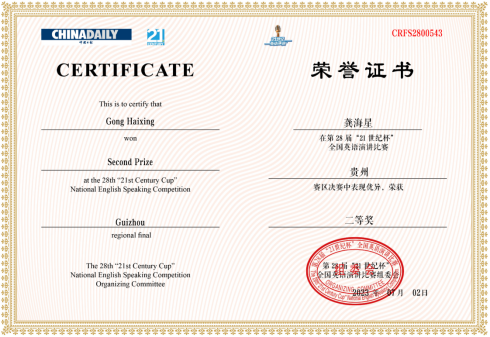 此外,在今年7月份的省赛阶段,由同花顺体育_同花顺(中国)胡静老师指导的杜征钦同学和龚海星同学分别斩获了省亚军和省级二等奖,赢得了评委专家的认可。同花顺体育_同花顺(中国)秉承“以赛促学”的教学理念,积极支持、鼓励学生参加各项赛事,并培养学生在多项国家级学科竞赛中取得佳绩。在本次大赛中,两位同学的精彩表现也展现出了贵州民族大学学生扎实的语言功底、出色的演讲水平和良好的思辨能力。
