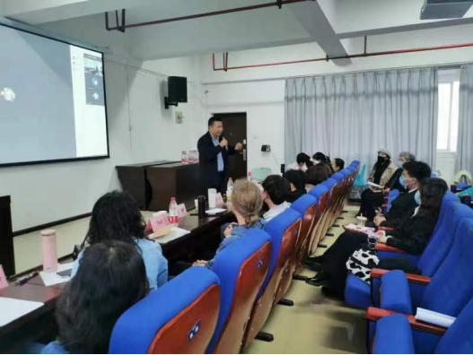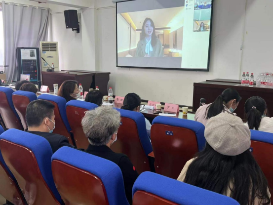 第二轮决赛在老校区15栋1109会议室举行,新校区12名选手和1名校外隔离的选手通过腾讯会议的方式连接老校区主会场进行比赛。除了定题演讲,还有3分钟的即兴问答环节,我院9名老师担任决赛评委,外教Nat担任提问考官。